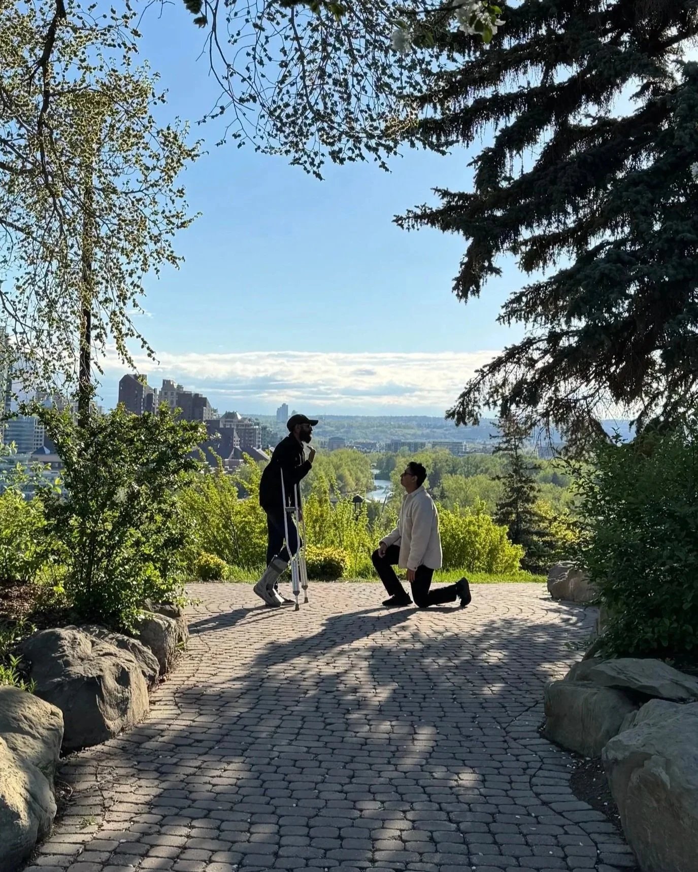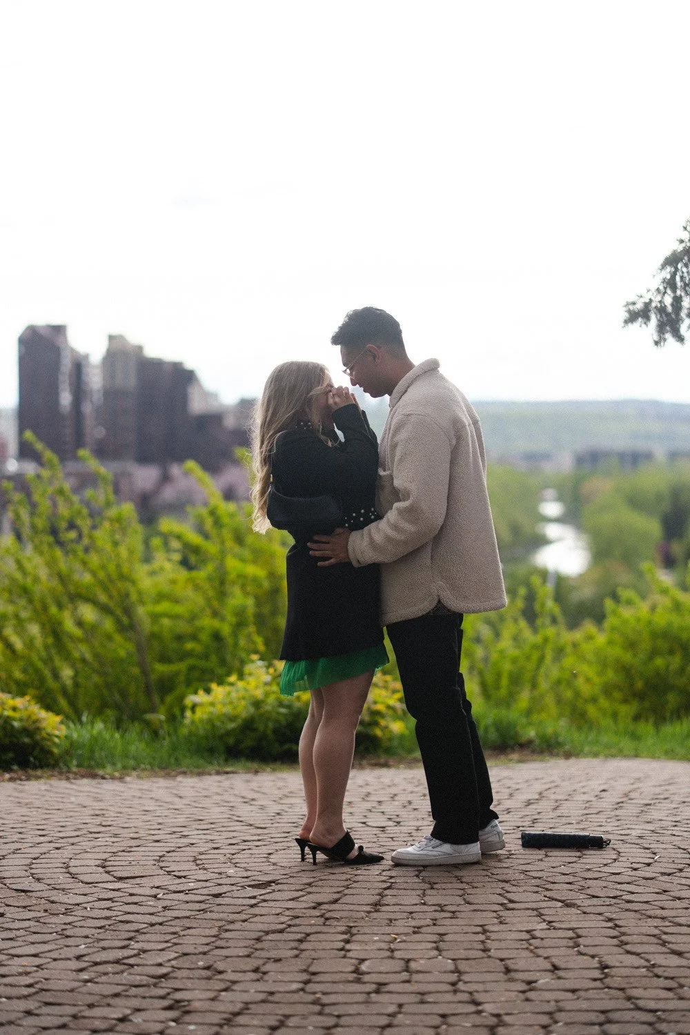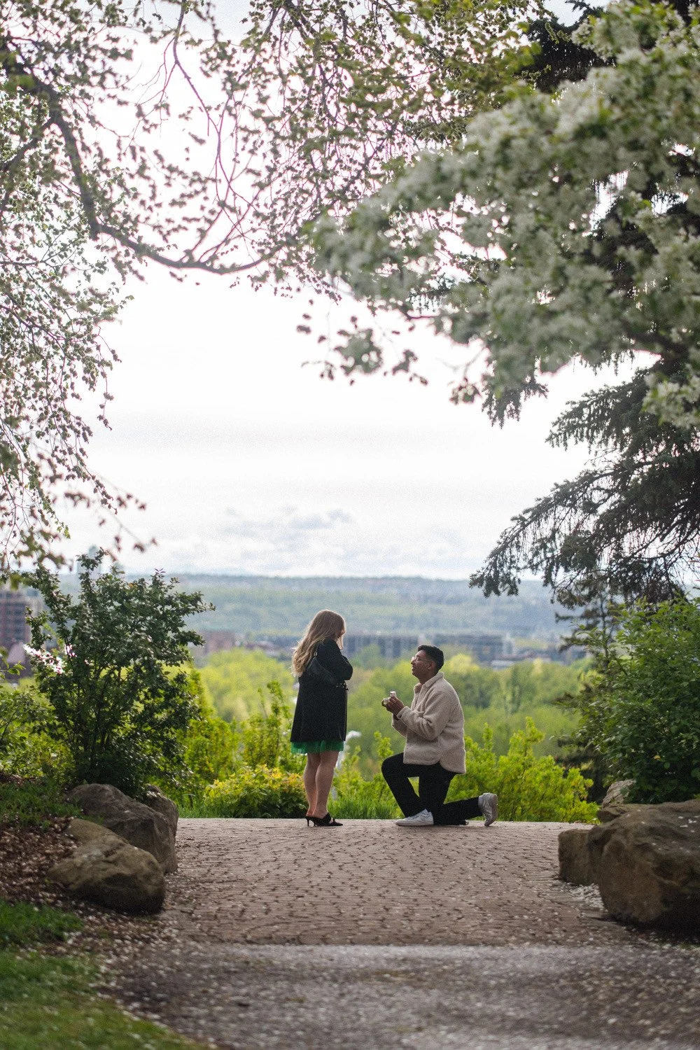 On the drive to Rotary Park, Marissa noticed the flashes of lightening and was suspicious about this ‘walk’ Nirupan insisted on. “It’ll clear, it’s moving the other way,” he chimed. Soon enough, they were strolling and he was stopping to smell the flowers before finally getting down on one knee as the sky cleared and the post-rain mist made for an incredible Calgary Skyline.